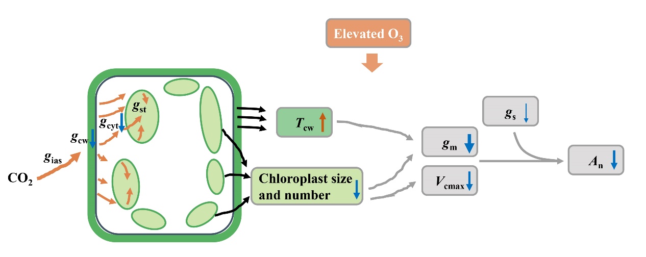 臭氧(O3)是对植物具有毒害作用的气态污染物。随着工业化和城市化进程加快,近地层O3浓度不断升高已经成为重要的大气污染物。高浓度O3通过气孔进入植物叶片内产生氧化胁迫,抑制叶片光合速率,进而降低植被生产力。叶肉导度是CO2从细胞间隙向叶绿体内Rubisco酶羧化位点传导阻力的倒数,与气孔导度和光合生化能力(最大羧化速率和最大电子传递速率)共同决定了叶片光合速率。团队前期在杨树的研究中已经发现O3浓度升高导致叶肉导度降低,是抑制叶片光合速率的关键,但是内在机理尚不清楚。