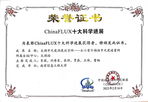中国通量网2022年学术年会暨二十周年战略发展研讨会于2023216-17日在北京召开,会上公布了由ChinaFLUX理事会牵头评选出的“ChinaFLUX十大科学进展”,我校“太湖中尺度涡度通量网”作为全球首个湖泊中尺度通量观测网成功入选。