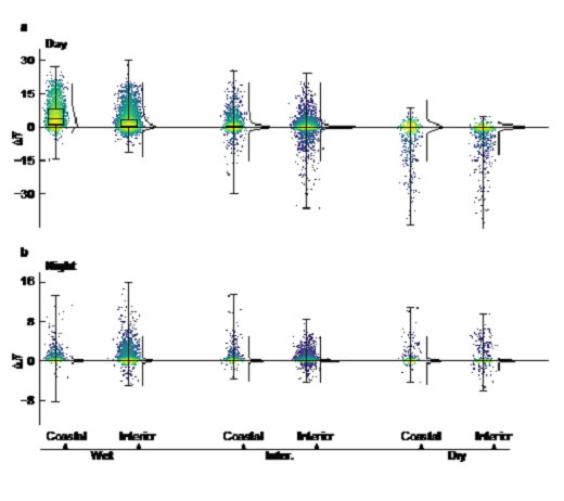 通常,城市比邻近的乡村更热。随着全球气温不断上升,城市居民面临的热迫越来越严峻。在高温高湿的地区,还有另一个更加复杂的因素—城市湿热。研究提出“湿球城市热岛”的概念,建立了计算“城市热岛”和“城市干岛”对城市湿热贡献的理论框架,包括:湿球城市热岛强度的理论表达式,湿球温度变化和非绝热过程的关系,以及近地面大气层湿静能(moist static energy)的交换过程。研究发现,在温带、寒带等气候区,温度和湿度对热胁迫的贡献相反,城市干岛效应要强于城市热岛效应;在高温高湿气候区,温度效应和湿度效应均加强城市热胁迫,导致每年城市热胁迫天数比乡村高2~6天。该研究结果是基于全球多站点的观测数据和城市气候模型共同得出的。