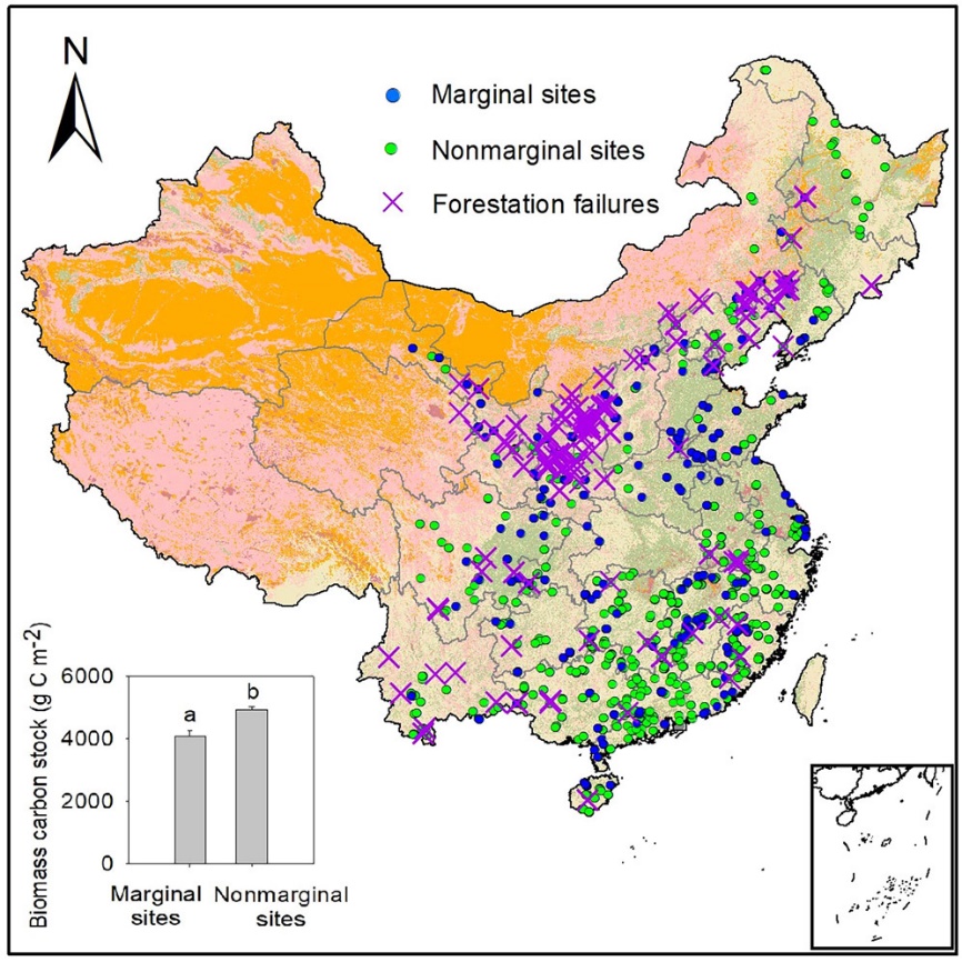 近日,实验室余振教授团队在Cell旗下的全球环境变化和可持续发展顶级期刊《One Earth》 (IF=16.2)上发表了题为“China’s forestation on marginal land was less efficient in carbon sequestration compared to non-marginal land” 的研究论文(https://www.cell.com/one-earth/fulltext/S2590-3322(23)00509-2)。