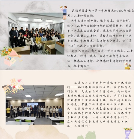 学海无涯,寻找知识和真理的路尽是坎坷,何其艰难,然三生有幸,得老师相伴一程风雪,老师为学生们答疑解惑、陪学生漫步人生路、与学生谈古说今,有老师在,那些执笔苦苦思索却不得其解的日日夜夜都有了支撑和希望。为了保存这些宝贵的时刻,学院学子通过一张张合影,诉说“我和老师的故事”。我们可以看到一个个孜孜不倦、润物无声的可爱园丁,他们用最朴拙的初心传道受业解惑;我们可以看到一个个勤勉求学、刻苦奋进的可爱学生,他们用最真挚的初心铭记师恩。在不经意间,老师的身影永远定格在他们的心里,穿过岁月的长河,也会记得老师带给他们的改变。