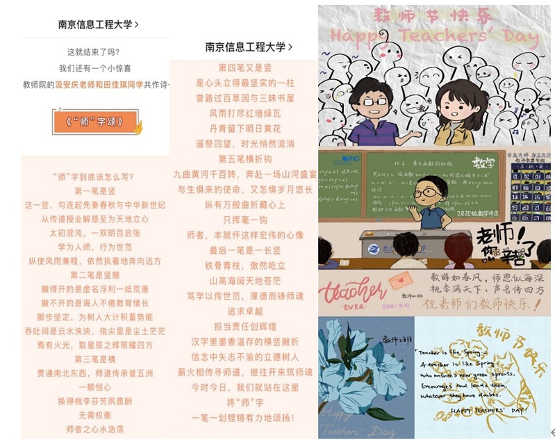 老师是人类灵魂的工程师,是文明的传承者,在平凡的生活里担任着最不平凡的使命,将一生无私奉献于三尺讲台,领着无数的学子由此出发,走向自己的人生理想,走到更远的地方。在这温馨的节日里,教师院2019级汉语言文学(师范)田佳琪同学和汲安庆老师共同创作了《“师”字颂》感谢我们生命中遇见的每一位老师;各班同学送上自己创作的绘画作品、手写卡片和诗词等表达对老师的深情祝福;9月10日当天上课的同学在精心彩排很多遍后,在上课前一起举起自己手写祝福,用真挚的文字传递情思、表达感恩,大声向自己的老师送上一句:“教师节快乐,您辛苦了!”学生们在手写卡片中写道:“一笔一划书写不完的,是您有的温柔和大度。千言万语诉说不尽的,是对您的感恩与祝福。在这个特殊的节日里,祝您教师节快乐!”