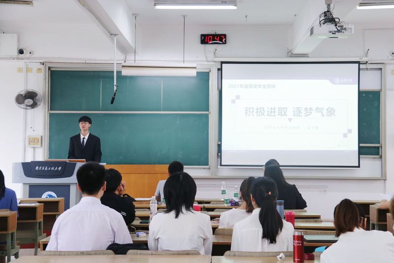 会议伊始,倪老师就学校2021年国家奖学金评选工作的文件精神、开展要求以及院内初审的情况向与会师生作了简要汇报。经宣传发动、学生申请、学院初审,此次共29名候选同学进入答辩环节。参加答辩的候选同学在五分钟内通过PPT演讲完整详实而不失重点地展示自己在学业成果、双创竞赛、团学活动、志愿活动、社会实践等方面取得的优异成绩,展示出优秀的综合素质和良好的个人风采。评委老师在每位候选同学答辩完毕后严格依据评选规则对其进行客观的评估与打分,整个评审过程高效紧凑,井井有条。
