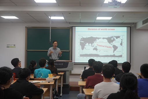 张文君教授首先用大家熟悉的概念入手,结合近期的天气与气候现象,引入海气相互作用这一主题。接着他从四个角度分层次地为大家介绍了ENSO。一是热带海洋的重要性,张教授用简单的模型向同学们解释海气如何进行相互作用,强调了热带太平洋在海气相互作用研究的核心地位。二是用简化跷跷板模型生动形象地介绍ENSO,让同学们快速理解ENSO究竟是什么,它又是如何表征海气之间相互作用的。三是ENSO的影响,张教授通过往年的实例,利用生动的语言,让大家明白ENSO对中国甚至东亚的气候变化都有显著的影响。四是介绍ENSO的历史背景,张教授向同学们讲述了人们在理论与实践中双双发现并探索ENSO的过程。