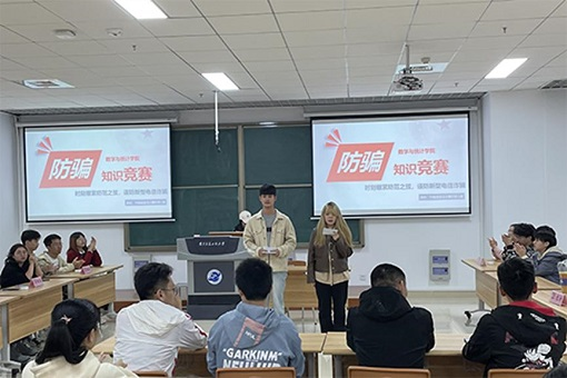 为深入学习贯彻习近平总书记关于打击治理电信网络诈骗犯罪工作的重要指示精神,切实增强学生防诈意识,提升防骗技能,10月22日晚数学与统计学院在藕舫楼205教室组织开展以“时刻绷紧防范之弦,谨防新型电信诈骗”为主题的防诈骗知识竞赛。活动由常冉和刘健同学主持,辅导员邵福生老师和各年级同学到场观赛。