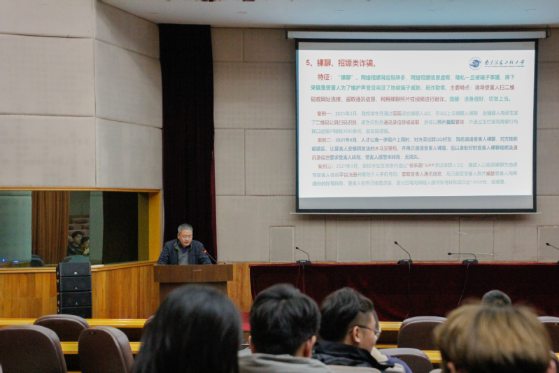 活动伊始,巨传友对当前电信诈骗的情况作了简要介绍并说明了开展预防电信网络诈骗相应指导、提高辨别能力和警惕性的重要性。随后,付兆锋就校园预防电信网络诈骗进行了详细宣讲培训。他首先传达了习近平总书记对打击治理电信网络诈骗犯罪工作的重要指示,提醒同学们当前电信网络诈骗方式不断变化,在校师生已经成为主要受害群体。他针对学校目前所发生的真实案例进行分析,总结了11种常见的诈骗类型,以形象生动的语言向同学们展现了诈术的狡猾与多变,以惨痛的案例教训提醒同学们捂好自己的钱袋子,同时强调安全员要担起身上的责任,时刻关注好身边同学的情况。紧接着,付兆锋讲解了有效的防诈方法,提醒同学们电信网络诈骗就在身边,遇事要冷静分析,及时求助老师同学,做好个人和家庭信息的保密工作,将防诈宣传培训作为学院常态化工作,传达落实至每一位师生,做到入脑入心。最后,他强调,防诈的核心就是提高每位师生的辨别能力和警惕性。全员防诈必须发挥班干部、宿舍长的责任担当作用,进行不定期班会,做到群防群控。