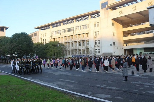 早上7点整,伴随着瑰丽的朝阳冉冉升起,升旗仪式正式开始。国旗班的旗手们迎着温暖的阳光,以饱满的热情,迈着铿锵矫健的步伐缓缓走来,庄严地护卫着鲜艳的五星红旗。在全院师生的注视下,雄壮的义勇军进行曲缓缓响起,同学们齐唱国歌。虽是寒风凛冽,同学们强烈的爱国热情却丝毫不减。