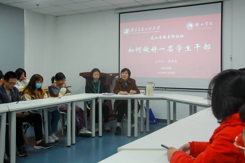 为推动师生交流互动、携手共进,全面提高学生干部的工作能力,龙山书院于11月25日下午在尚贤楼302举行导师沙龙第一期——”如何做好一名学生干部“专题分享交流活动。龙山书院生活导师张翠英老师及2021级部分班级学生干部参加活动。