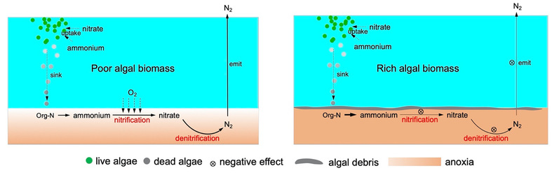 反硝化作用是湖泊生态系统氮循环关键环节,是调控湖体氮水平主要途径之一。在富营养化湖泊中,藻类浮游植物往往大量生长。传统认为,藻类腐烂分解为反硝化过程提供碳源,并创造缺氧环境,加速脱氮进程。该研究团队发现,低藻生物量的确促进了反硝化脱氮,但高藻生物量对反硝化脱氮产生了抑制效应。分子生物学分析表明,高藻生物量引起了水体持续缺氧,限制了硝化作用,减少了硝态氮底物供给,进而对反硝化脱氮产生抑制效应(硝化-反硝化解耦合效应)。基于此机制,该团队提出了湖泊水体藻含量调控沉积物反硝化脱氮格局的新认知并在江苏太湖得以原位验证,建立了基于水体藻生物量评估沉积物反硝化脱氮效率的量化方法,为藻华湖泊沉积物反硝化脱氮快速测定提供新思路。