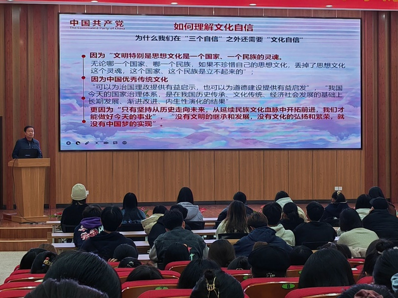 范勇书记首先介绍了“四个自信”重要意义、深刻内涵与内在联系,随后着重介绍了什么是文化自信,讲述了它与其他三个自信之间的关系,为什么要坚持文化自信,如何坚持文化自信等。他说,中华民族博大精深的优秀传统文化为我们提供了深厚的文化软实力。在优秀传统文化上的继承和发展,夯实了我们文化建设的基础,奠定了文化自信的根基。文化的优秀,国家的强大,人民的力量为文化自信提倡了强大的底气。源远流长,博大精深的中华文化是中华民族的根和共同的精神家园。正如习近平总书记指出,“要努力展示中华文化独特的魅力。”他鼓励广大学子要积极争做优秀传统文化的传播者、践行者。而我们每一位大学生,作为优秀的中华儿女,更要坚定文化自信,发展先进文化,弘扬民族特色,助推国家的软实力提升,为建设文化强国添砖加瓦。