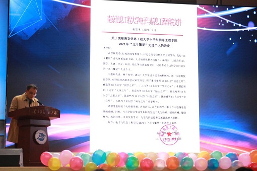 典礼伊始,2021级周健、李蔡艳、季宇恒、薛孜悦四名同学带来了诗朗诵《新征程 新起点》。随后电信院院长张治中宣读2021年“北斗繁星”先进个人表彰决定,并鼓励获奖同学再接再厉。经过层层申报,评定与筛选,共从全院本科生和研究生中评选出包括“信念之星”、“团学之星”、“学业之星”、“科创之星”、“励志之星”、“文体之星”、“班干之星”、“班导之星”、“志愿之星”在内共156位“北斗繁星”,希望电信院广大学子及获奖星星们可以继续努力奋斗,成为耀眼繁星。