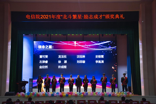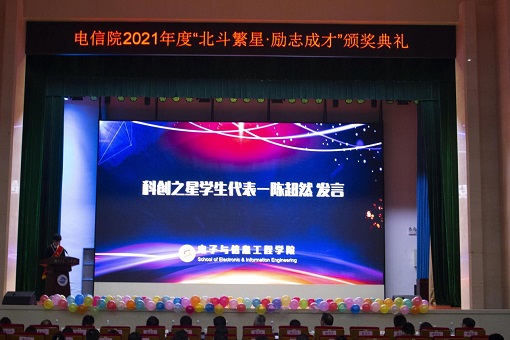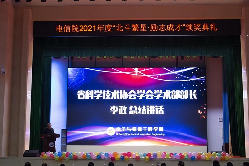 为表彰优秀学子,树立典型先进,进一步调动学生拼搏的主动性和积极性,12月16日晚,电子与信息工程学院在风云剧场举行2021年“北斗繁星·励志成才”颁奖典礼。江苏省科协二级巡视员、学会学术部部长李政,江苏省科协学术部一级主任科员陈君,校科技处副处长李蓓蓓,校科技处副处长林文明,电信院全体院领导,班主任代表,全体辅导员,本科生和研究生各班学生代表以及2021级本科全体同学参加会议。