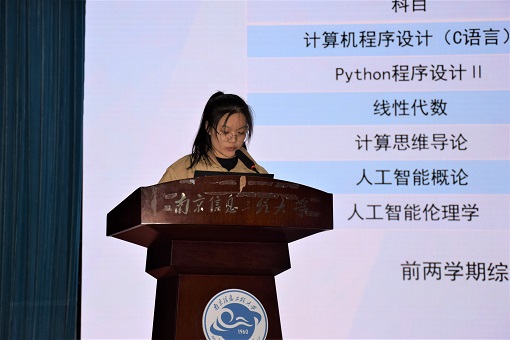 首先上台的是人工智能学院的王田田,是国家励志奖学金获得者。她主要从学习、科研、工作和社会实践四个方面为在场同学进行经验分享,并就这四个方面分别给出“博学”、“创新”、“负责”、“实干”四个关键词。她通过自身经历和经验为同学们讲解自己在大学期间所获得的主要成绩以及过程中的心路历程。最后,王田田用一句话为在场同学送去鼓励:“青春无畏,追梦无悔。愿大家珍惜青春时光,爱你所爱,行你所行,听从你心,无问西东”。