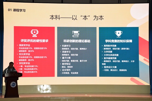 紧接着,长望学院2018级电子信息工程(1)班的刁晨昊上台宣讲,他以“学会平衡全面的发展”为主题,事无巨细为在场同学讲述理工科的主要学习方法。刁晨昊是校长奖学金和国家奖学金的获得者,他尤其强调了学习成绩对于评奖评优以及保研的重要性,以此劝诫同学们珍惜时间,把握机会。同时,刁晨昊还向同学们介绍了相关竞赛的含金量,强调何种竞赛将会在今后的求学道路上有更大的助益。
