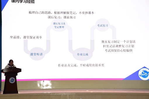 随后,环科院18级大气环境专业的方新竹她以尝试、探索和选择为主线,指引同学们找到自己喜欢并适合的学习方法。方新竹虽然两次获得国家奖学金,以优异的科研和学习成果成功保送至南京大学,但她为大家讲述了自身大学生活中曾有的迷茫与困惑,极大的激发出在场学生的情感共鸣,她分阶段论述自己大学三年心态上的变化,强调及时调整自身情绪与状态的重要性,并为大家传授期末如何复习,干货满满,使在场同学收获颇丰。