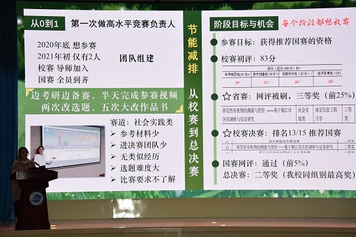 最后上台的是,环科院校长奖学金、国家奖学金的获得者王雪晴,目前已保送至环科院攻读硕士学位。她以“心怀感恩,励志成才“为主题,就抓住机会和永不放弃回顾了自己的大学成长轨迹。她介绍自己参加互联网+大赛的心路历程,从曾经的小透明到自己收获独特的风景,她真挚的情感流露,使在场同学无不动容,在她的讲述中了解到科研工作的不易,同时激发出在场同学对于科研所带来的成就感和获得感的向往。