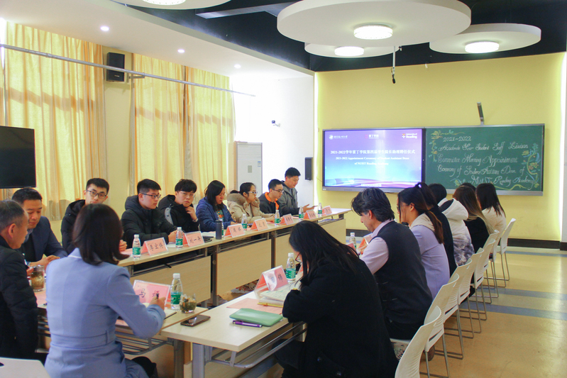 2021年12月31日下午,雷丁学院在雷丁楼N109举行了2021-2022学年雷丁学院师生联席委员会会议暨第四届学生院长助理任聘仪式。院长马嫣,副院长周锦,副院长郭栋,外籍教师代表Chaman老师,学生办公室主任沈霄,团委书记李鸣,教学管理科殷雪莉,以及7位新聘学生院长助理和三名学生代表参加了会议。本次会议由学院党总支书记殷跃峰主持。