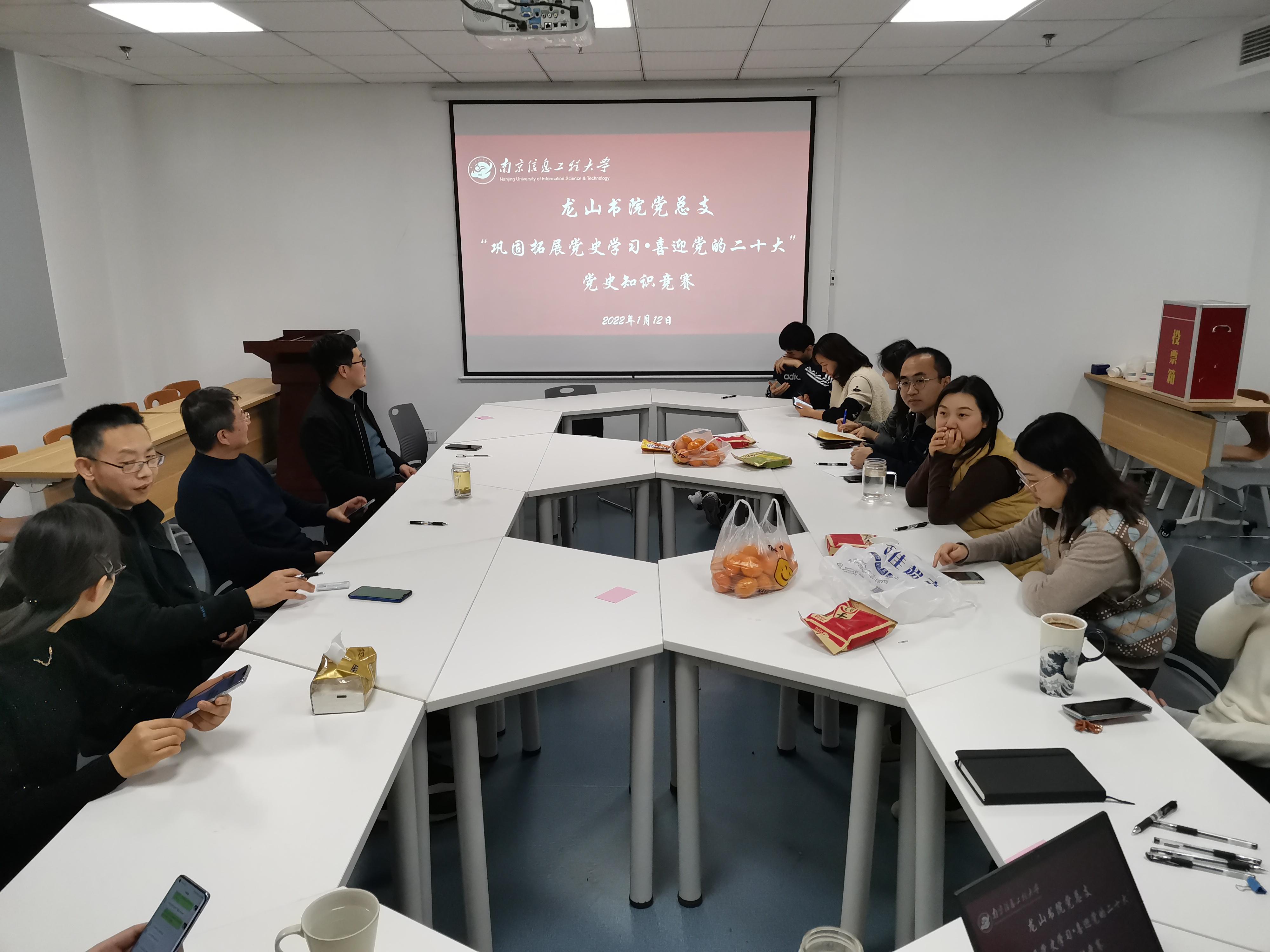 为巩固拓展党史学习教育成果,进一步加深广大党员对党的历史、理论和政策的认识,1月12日下午,龙山书院党总支在尚贤楼302开展“巩固拓展党史学习•喜迎党的二十大”党史知识竞赛。活动由龙山书院办公室副主任滕雅文主持,书院全体教师参加。