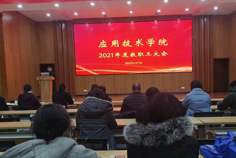 1月7日下午,应用技术学院在滨江楼报告厅召开2021年度工作总结大会,学院领导班子和全院教职工参加会议。大会由应用技术学院院长张军主持。
