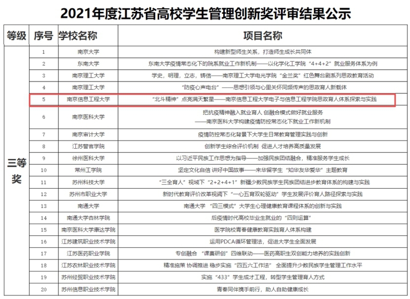 近期,江苏省高等教育学会高校学生管理研究委员会在省教育厅指导下,组织开展了2021年度江苏省高校学生管理创新奖及优秀著作评审,电子与信息工程学院申报项目《“北斗精神”点亮满天繁星——南京信息工程大学电子与信息工程学院思政育人体系探索与实践》获评三等奖。