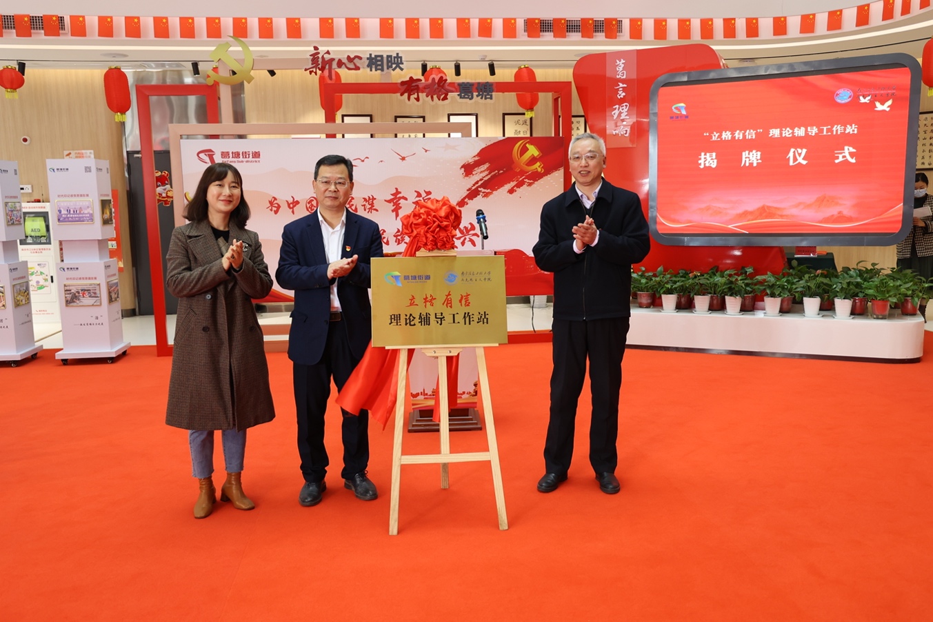 今年是党的二十大召开之年。为创新理论学习形式,提高基层理论学习成效,3月4日上午,南京信息工程大学马克思主义学院党总支与葛塘街道党工委共同开展“葛言理响”理论宣讲品牌发布暨“立格有信”理论辅导工作站揭牌仪式活动。马克思主义学院党总支书记李志江、葛塘街道党工委书记余建军、江北新区宣传和统战部副部长袁征、马克思主义学院师生代表、社区党员代表参加了本次活动。