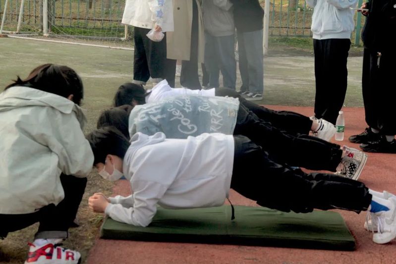 伴着灿烂的阳光,女同学们陆续走进操场,男同学们则在单杠处集合,由工作人员进行人员的核对登记,并宣读比赛规则。随着计时员一声令下,大家开始进行身体素质测试。女生进行平板支撑的素质测试,男生则进行引体向上的素质测试。本着友谊第一、比赛第二的精神,操场上一片欢腾之景,同学之间相互加油鼓劲,焕发出青春的活力。
