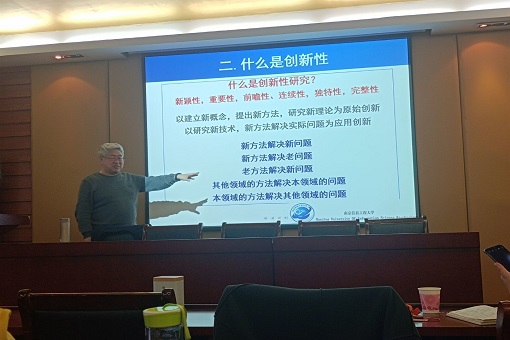 接下来,行鸿彦教授分析了创新性研究的特点“新颖性、重要性、前瞻性、连续性、独特性以及完整性”,他凝练了五种方式教会同学们“创新性研究”从何处入手,指出创新需要同学们在前人研究的基础上,进行细致地分析,并且要学会利用多个领域的知识进行融会贯通来解决问题。在大学生成长与创新性培养方面,行教授给出了他的七个四字方法,“自动自发、自立自强、自树一帜、自知之明、自我革新、自告奋勇、自我约束”,鼓励同学们要独立自主,对于自我有清晰的认识,在机遇面前要敢于争取,在困难面前要敢于迎接挑战,面对诱惑要能自我约束。