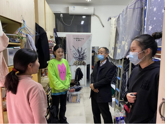 每到一个学生宿舍,殷书记和辅导员老师都与同学们亲切交谈,教育引导同学们增强疫情防控意识,自觉服从学校疫情防控要求,加强宿舍管理和学风建设,养成自主自律的学习生活习惯,保障身心健康全面发展。在毕业生宿舍,殷书记关心询问毕业生就业去向,对申研、考研成功的同学表示祝贺和祝福,希望他们能够坚定理想,逐梦远航。走访学生宿舍期间,殷书记和辅导员老师深入了解疫情防控期间学生们的思想动态、线上学习和生活状况,现场解答同学们学习生活等方面的问题和困惑,鼓励同学们保持良好的身心状态,师生携手共同坚守校园“抗疫”阵地。