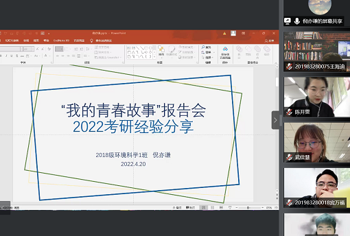 常态化疫情防控背景下,为促进学院2019级同学对疫情防控中青年担当的高度认同,将伟大抗疫精神转化为拼搏进取的强大动力,帮助他们进一步强化考研深造学业目标,吸取历年考研经验,坚定未来奋斗决心,4月20日-25日,在院党委副书记、副院长李岩和19级辅导员阮小燕的指导下,环科院2019级各班级开展了主题班会暨“我的青春故事”报告会活动,活动邀请2018级杜可蒙、2019级研究生曾靓莹等13位青年学生骨干讲述他们疫情下的青春奋斗故事,分享考研心得和读研经历,以切身经验和体会引导同学们坚定理想目标,持续奋斗。