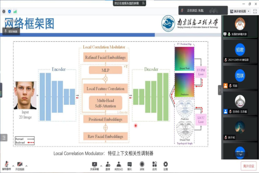 朱磊同学以“基于单幅图像的三维人脸重建(3DMM)深度学习算法研究”为题做汇报,他详细介绍了两项3DMM算法,第一项工作精心设计了一个由上下文相关性调制器、形状上下文约束和UV回归约束的3DMM模型,使得算法更加关注人脸的显著特征,可以将模型迁移到现实世界;第二项自监督模型利用部件掩膜分割损失优化了模型对人脸中鼻子、嘴巴等器官的重建,极大地提高了模型的精度。