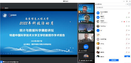 4月27日,数学与统计学院通过线上形式开展了2022年科技活动月“统计与数据科学藕舫讲坛”学术分享活动,本期活动邀请了中国科学技术大学王学钦教授做报告。报告由数学与统计学院副院长曹春正主持,多位老师及其研究团队和学生积极参会听取报告。