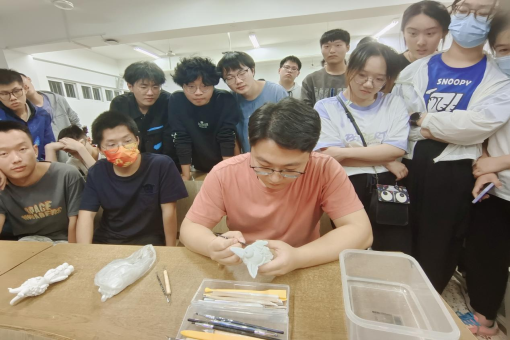 杨昇老师现场为学生示范石塑黏土的制作过程,包括制形、修整、上色等步骤。他强调,制作优秀的黏土作品并不一定要技术上的高超,而是一颗热爱、认真的心,要作到入心、耐心、细心,这样才能作出饱含情感的作品。随后,杨老师为大家分发了各类制作工具,鼓励同学们积极创作,后期会进行优秀作品评选。