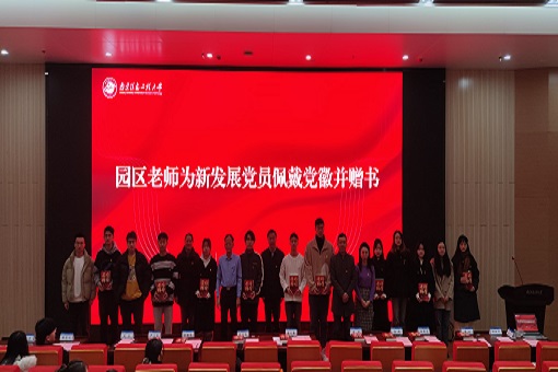 会议伊始,顾显跃宣读新发展党员名单。园区老师们随后为新发展党员佩戴党徽并赠送园区学生党员指定阅读书籍《苦难辉煌》。在园区党委书记蒋元春带领下,全体党员面向党旗进行庄严的入党宣誓。随后,园区研究生第一党支部李鑫志作为本次新发展党员代表进行发言。