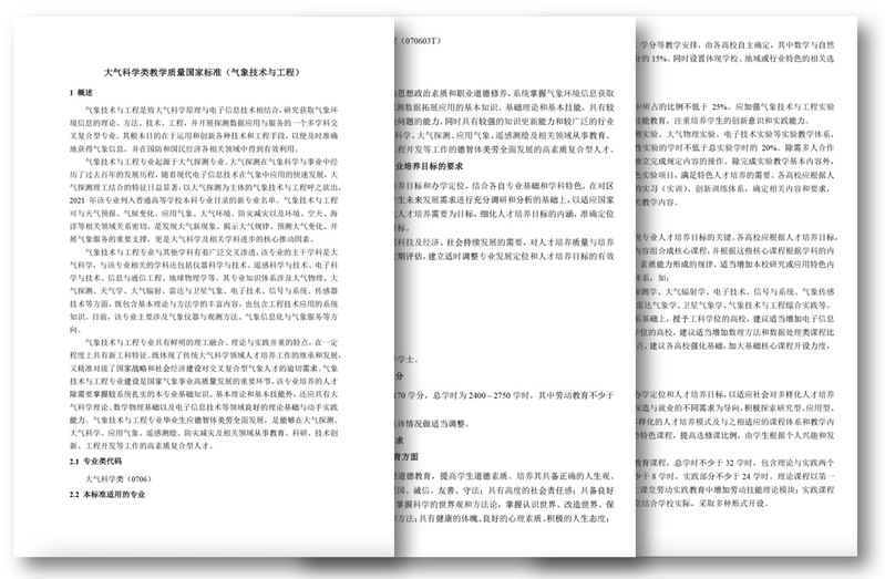 质量标准:2022年11月,我校与国防科大合作完成《大气科学类教学质量国家标准(气象技术与工程专业)》的撰写。学院依托校院两层的文件制度,规范教学基本过程和教学管理,形成全面有效的激励和约束机制。