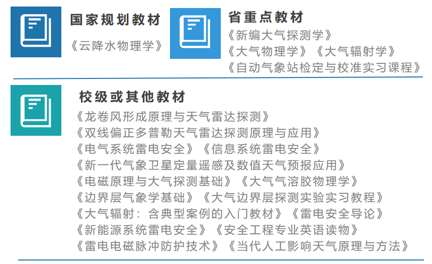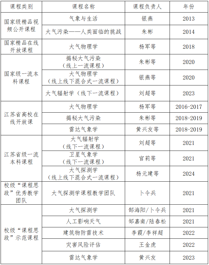 近年来,学院建成国家级精品视频公开课程2门、国家精品在线开放课程1门、国家级一流本科课程3门、江苏省高校在线开放课程2门、江苏省级一流本科课程3门。5门课程获校级专业核心课程改革立项建设。5门课程获批校级“思政课程”示范课程。大气探测学课程教学团队获批校级“课程思政”优秀教学团队。大气物理教研室获评校级优秀教学基层组织。