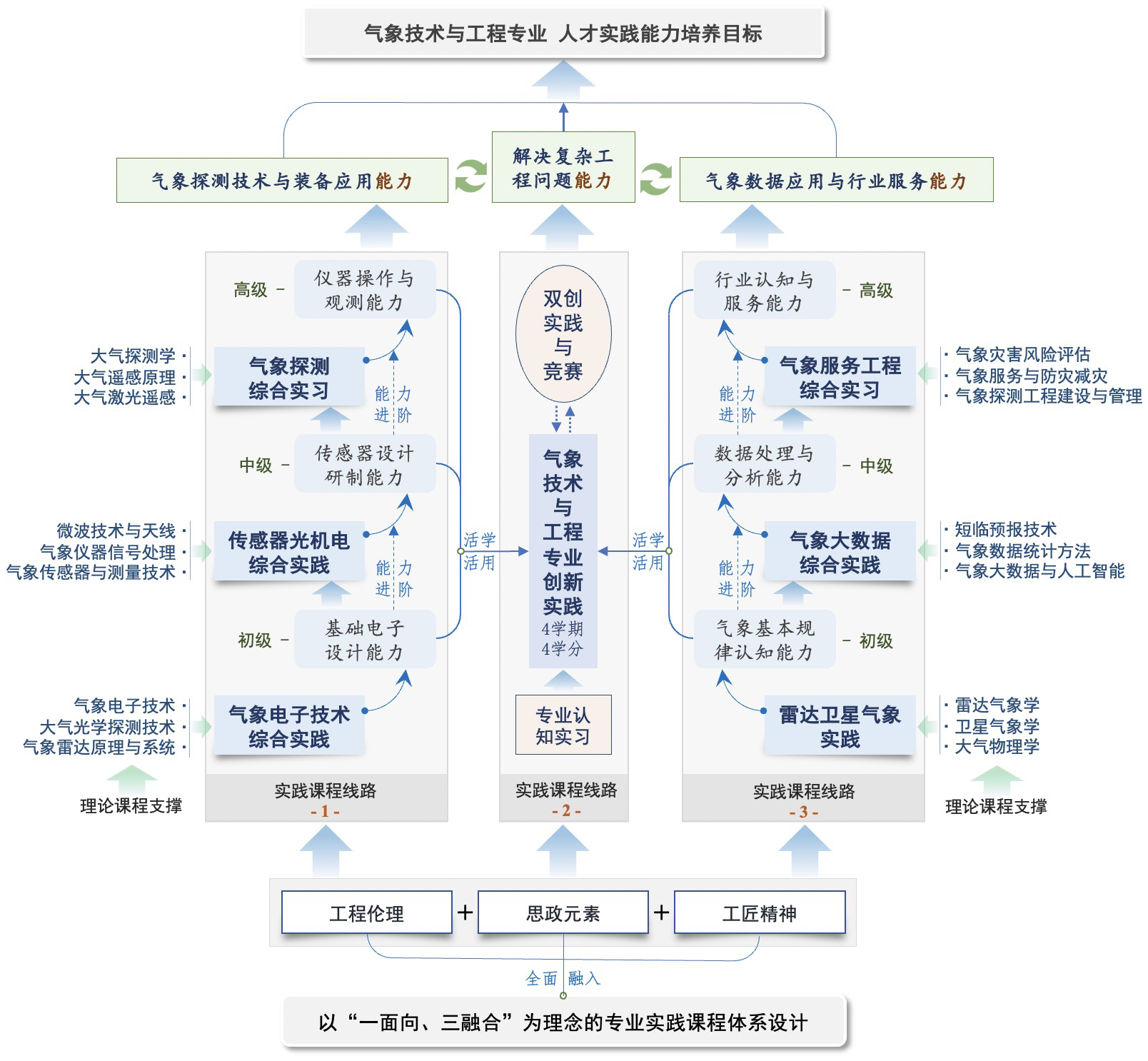 气象技术与工程课程体系突出多专业、多学科交叉的理工融合特色,注重传统课程的升级改进,围绕气象探测技术与装备工程、气象探测原理与数据应用两个专业内涵进行设计。