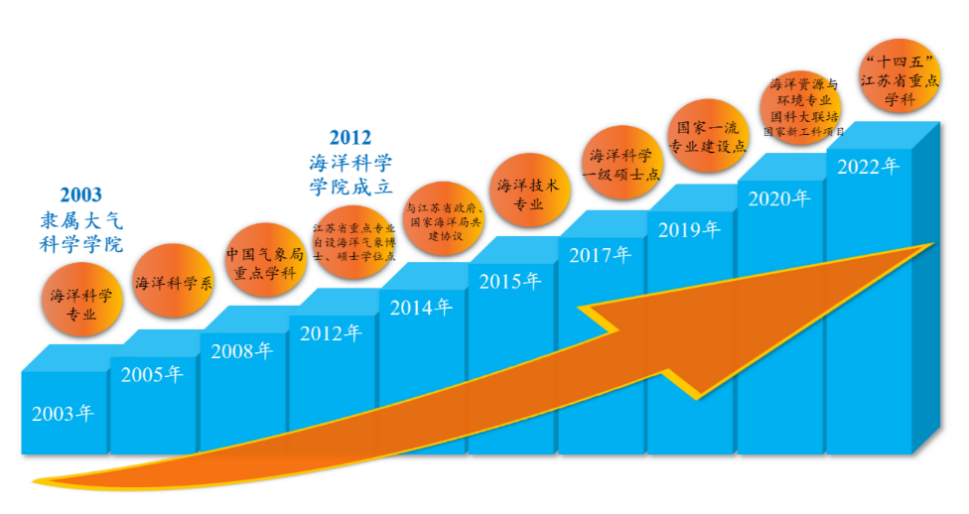 海洋科学专业于2003年招收第一批本科生,隶属当时的大气科学学院,2005年组建海洋科学系,2008年被评为中国气象局重点学科,2012年获江苏省重点专业。2012年1月,海洋科学学院正式独立运行,同年自主设置海洋气象学二级学科硕士点和博士点。2014年江苏省人民政府和国家海洋局达成共建南京信息工程大学协议,重点建设海洋科学专业,2015年增设海洋技术本科专业,2017年获批海洋科学一级学科硕士点,2019年获批海洋科学国家一流专业建设点,2020年增设海洋资源与环境专业,同年增设国科大海洋科学联培班,2020年获批海洋技术国家新工科项目,2022年海洋科学获批“十四五”江苏省重点学科。