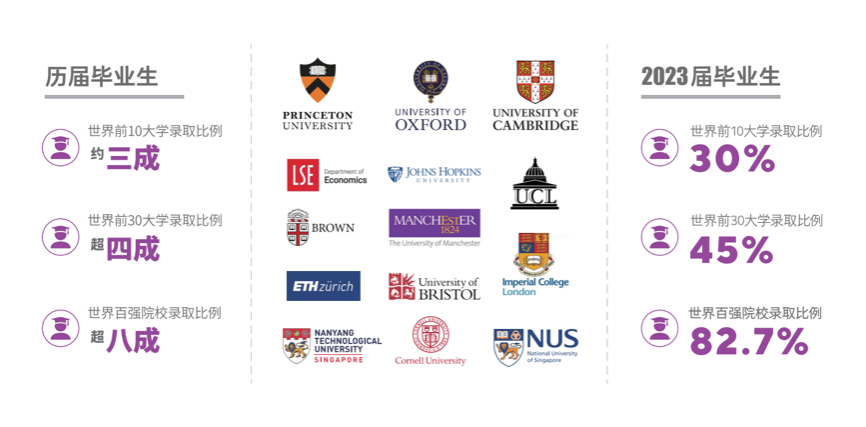 学院已有6届毕业生,历届毕业生就业率99%,升学深造率将近90%,海内外深造的毕业生中超80%进入世界百强院校,被世界前10大学录取比例超30%,包括英国牛津大学、剑桥大学、帝国理工学院、伦敦大学学院、伦敦政治经济学院,美国普林斯顿大学、哥伦比亚大学,瑞士苏黎世理工学院、新加坡国立大学、南洋理工大学等世界名校深造。