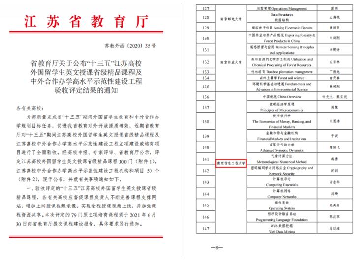 学院思想政治教育课程及公共通修课程为保障教学效果使用中文授课,其他专业课程均采用全英文教材、全英文授课与考核;专业核心课程全面对接雷丁大学教学计划,与外方同步授课;同时各个专业在入学初、学习不同阶段邀请该领域专家为学生做专业导论和专家讲坛,并结合中国学生特点、国内行业产业需求和南信大学科优势,开设专业基础课和特色方向性选修课,形成了既对接国际标准又体现中国国情和南信大特色的专业课程体系。