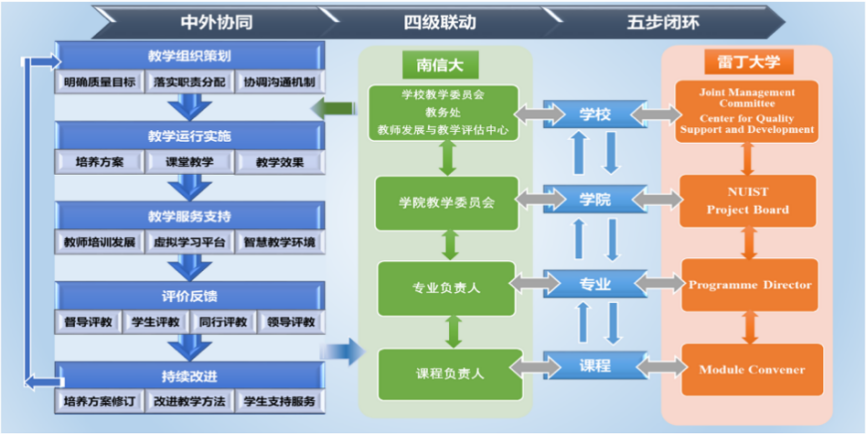 对标英国QAA的规范和要求,建立了“中外协同、四级联动、五步闭环”的教学质量保障体系,从学校、学院、专业、课程四个层面,联合雷丁大学质量支持与发展中心、项目委员会、专业负责人和课程负责人共同构成闭环运行、持续改进的教学质量监控与考核体系。学院制定教学活动管理流程、教学质量考核标准、教学考核时间节点和主要内容,中外双方全程参与、对教学全过程进行监控、评价、反馈和管理。