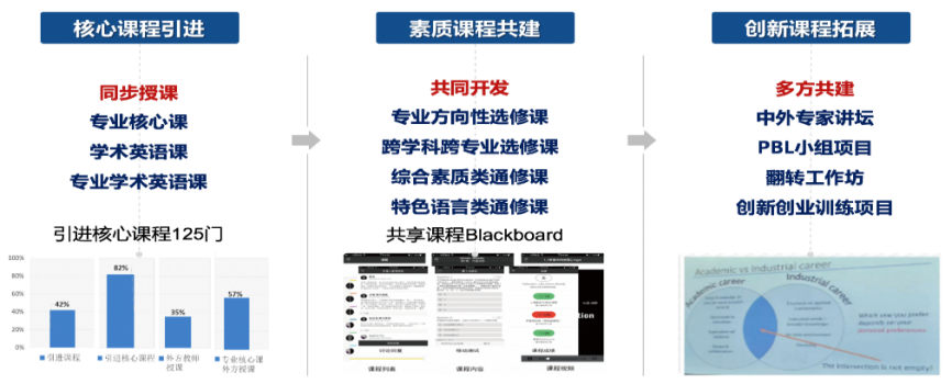 学院对标英国高等教育质量保障体系(QAA)国际标准,全面引进外方课程、教材、教案等优质教学资源,实行中外学生培养过程统一标准,引进外方专业课程近200门,约占所有课程的80%,其中专业核心课程中外方引进的比例高达89%。引进雷丁大学Blackboard在线学习平台并进行了本地化,依托该平台实现对雷丁大学教学资源全面共享、教学过程中外双监控、学生学习效果及时在线反馈等目标,每年在Blackboard上线课程近200门。