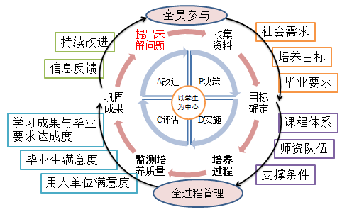 基于“以学生为中心、产出导向、持续改进”的OBE(Outcomes-Based Education) 教育理念,借鉴全面质量管理(TQM, Total Quality Management)和戴明环理论(PDCA,Plan-Do-Check-Action),构建多元开放式的教育教学质量监控与改进体系,贯穿教学各环节和培养全过程。