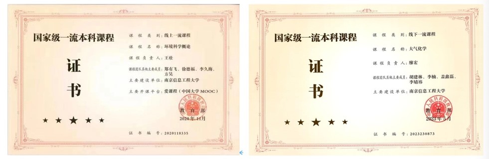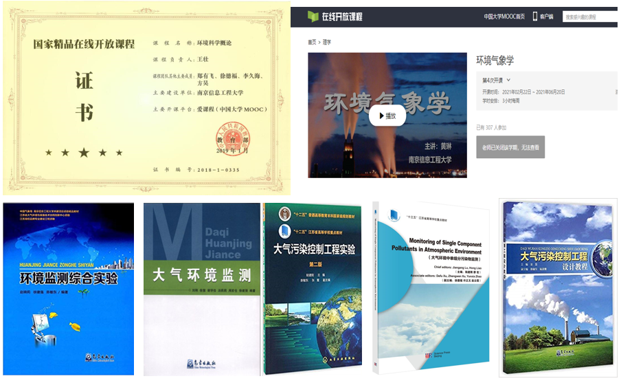 环境科学专业入选国家一流专业建设点,环境工程专业通过教育部工程认证。《大气化学》和《环境科学概论》入选国家一流课程,《环境科学概论》入选国家精品在线开放课程,已面向厦门大学等75所院校完成9期线上开课,累积选课人数16555人;《大气化学》教材与课件已被浙江大学、山东大学、中国地质大学和中山大学等著名高校广泛使用;《环境气象学》、《固体废弃物处理与处置》等入选江苏省高校在线开放课程。出版《大气污染控制工程实验》(“十二五”普通高等教育本科国家级规划教材)、《大气环境监测》、《环境监测综合实验》、《新编大学化学实验》(江苏省高等学校重点教材)、《定量分析实验与技术》、《有机合成化学及实验》等特色教材。