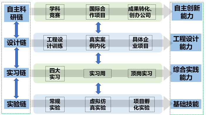 多措并举,注重交叉,构建了理论知识与实践能力交替攀升,基础、设计、综合实践和自主创新“四层递进”的创新能力实践教学体系,实现4年实践教学不断线;同时创建实验、工程设计、实习、自主科研融合的“四链一体”实践教育模式。