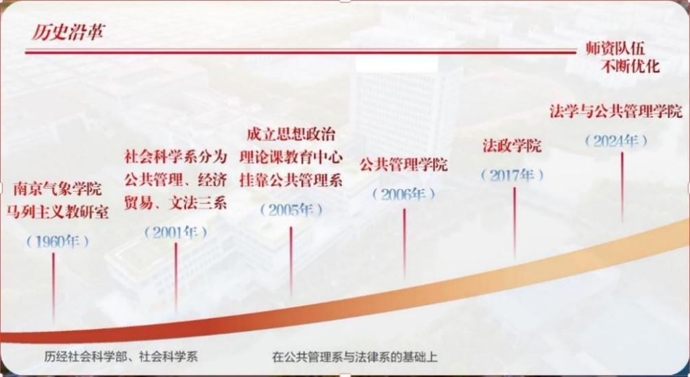 法学与公共管理学院源于1960年南京气象学院马列主义教研室,历经社会科学部、社会科学系;2001年社会科学系分为公共管理、经济贸易、文法三系;2005年成立思想政治理论课教育中心挂靠公共管理系;2006年在公共管理系与法律系的基础上,成立公共管理学院;2017年更名为法政学院;2024年3月更名为法学与公共管理学院。