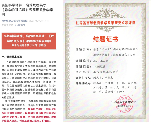 积极进行教学改革,提高课堂教学水平,改进课堂教学模式与方法,建设线上线下教学资源,探索教育教学、人才培养新思路、新模式。定期修订培养方案,通过用人单位调研、在校生座谈、专业教师研讨、同行专家论证等,广泛听取意见,了解社会与行业的需求,优化课程体系,坚定不移推进教学改革,取得显著成效。自2020年以来,学院教师获评省教学名师1人,入选江苏高校“青蓝工程”优秀教学团队1个,获江苏省教学成果奖一等奖1项,获国家级一流本科课程2门、省重点教材5部,获批教育部高等学校大学数学教学研究与发展中心教改项目1项、省级教改课题5项,获江苏省高校教师教学创新大赛特等奖1项、江苏省青年教师教学水平大赛二等奖1项、江苏省高校数学基础课青年教师授课竞赛一等奖 2项。