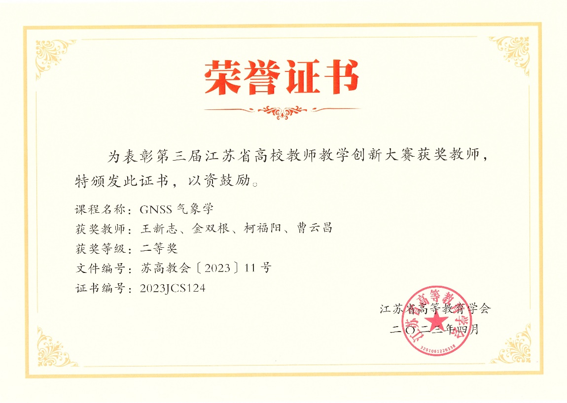 近三年,学院教师积极探索线上与线下混合、理论与实践结合、科研与教学融合的课程建设理念,共建设校级及以上一流课程6门,其中《GNSS气象学》获批为国家一流课程,《遥感原理》获批江苏省在线开放课程,《遥感原理与应用》获批为江苏省一流课程。