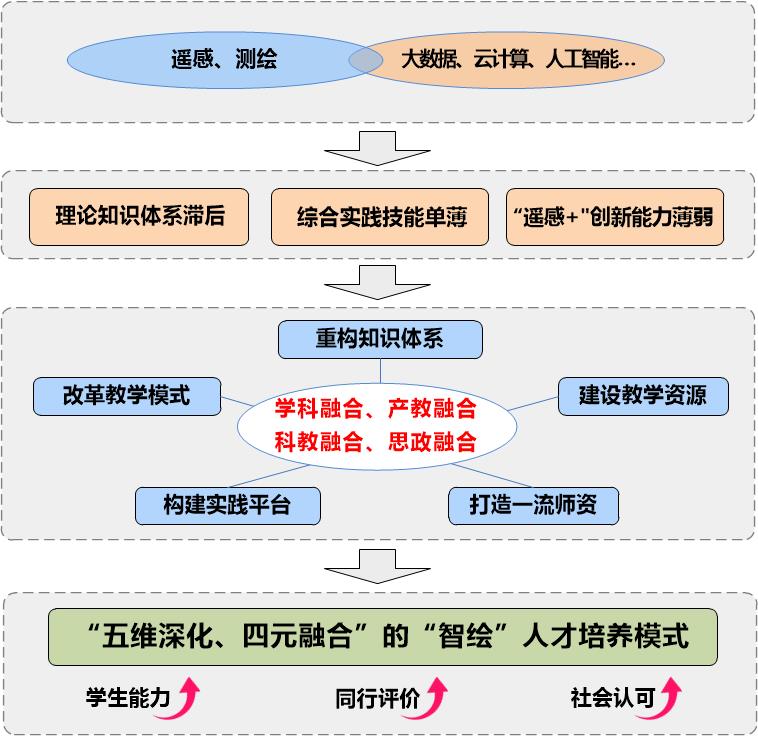 针对测绘类专业学科交叉与发展快速的特点,面向经济社会发展和行业需求,以工程教育专业认证为契机,以一流专业建设为引领,践行OBE理念,转变教育重心、拓宽教育内容,通过“打造一流师资、重构知识体系、改革教学模式、建设教学资源”等举措,努力实现学科融合、产教融合、科教融合、思政融合,构建了“四维深化、四元融合”的面向智能时代复合型创新“智绘”人才培养模式。