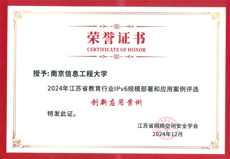 近日,在江苏省网络空间安全学会和中国教育和科研计算机网华东北地区网络中心联合举办的江苏省教育行业IPv6规模部署与应用案例评选中,我校网络信息中心报送的《IPv4/IPv6双栈改造:提升校园网与云平台网络性能的创新实践》荣获“创新应用案例”。
