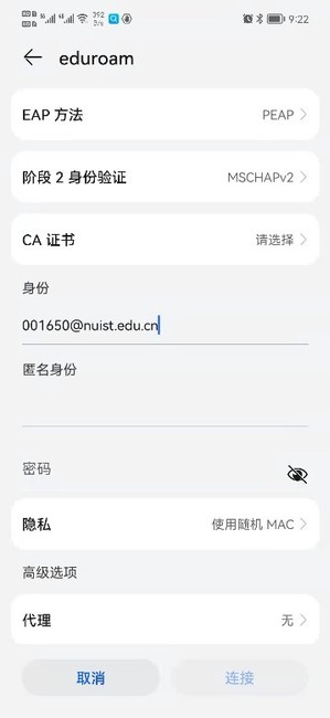连接“eduroam”无线信号出现配置页面。【EAP方法】默认为PEAP